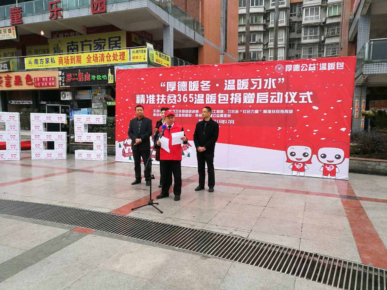 2016年12月23日清晨,随着《爱的奉献》悠扬旋律,“2016厚德365温暖包发放启动仪式”在西城区广场隆重举行。习水县企业家商会会长、贵州省厚德公益基金会理事长李彬先生在启动仪式上发表讲话 :“爱人者,人恒爱之! 给予别人的是幸福,自己收获的是快乐;给予别人的是温暖,自己收获的是满足;给予别人的是关爱,自己收获的是真情。只要人人都献出一点爱,世界将变得更加美好温馨。让我们共同努力,为更多贫困儿童带去温馨和祝福,为建设和谐、富裕、人文新习水再谱爱的华章”!