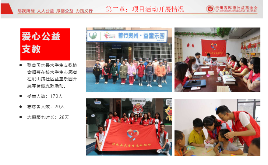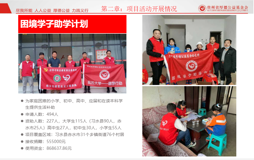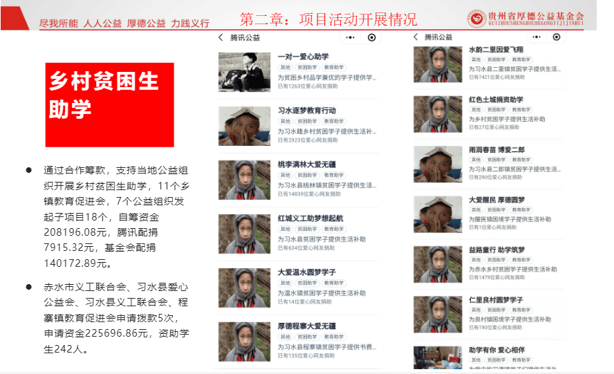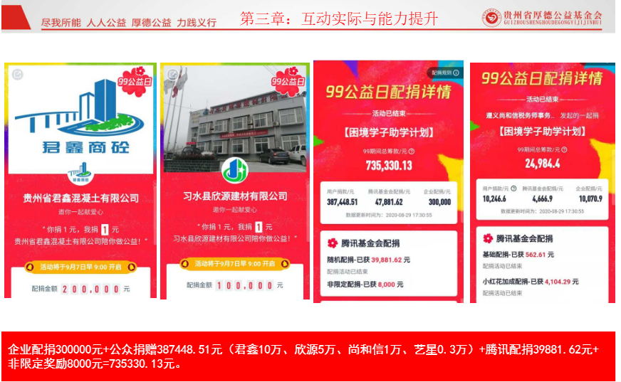 理事陈友强建议君鑫公司定向捐赠发起“君鑫商砼助学计划”,树立企业公益品牌,利用好“99公益日”链接上下游合作企业共同参与公益慈善,每年寒假筹办习商公益论坛暨习水县大学生公益座谈会。