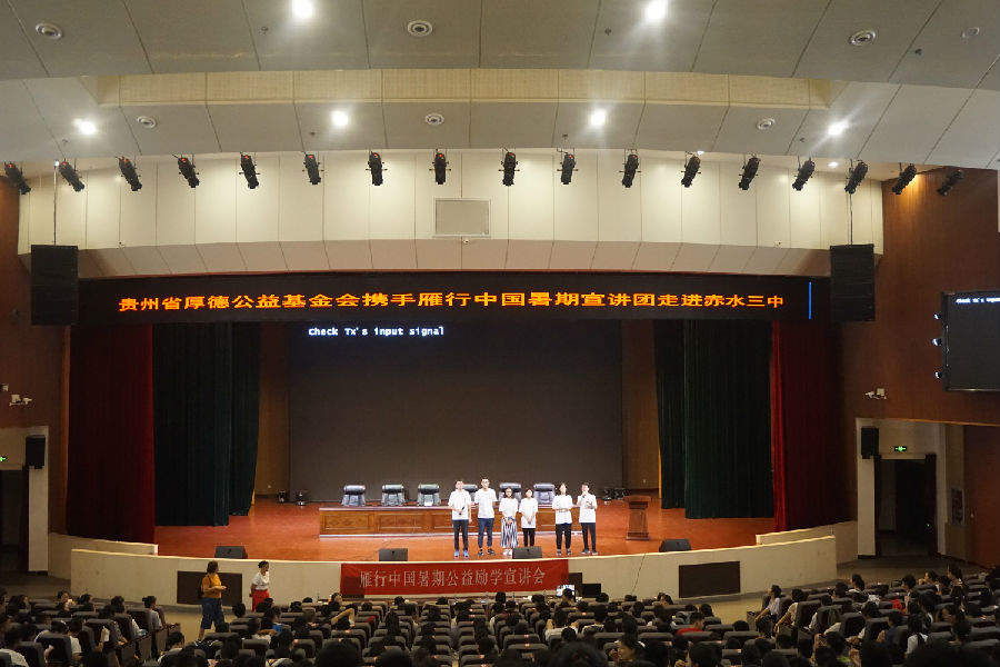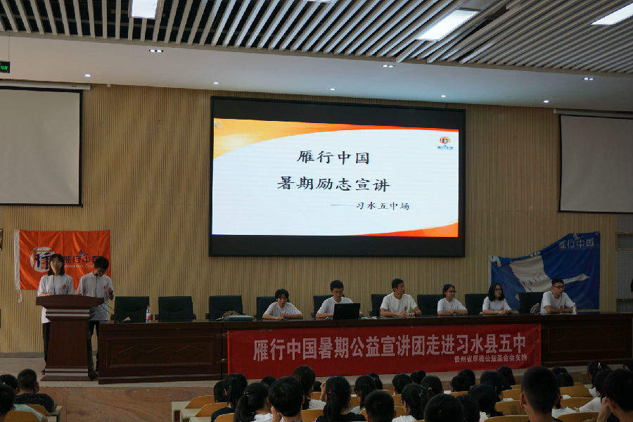 雁行中国贵州习水团由贵州省厚德公益基金会益动习水—青年公益支持项目资助于2015年组建,在团长田辉的带领下,来自清华大学、中国人民大学、北京师范大学、南京大学、南京航天大学、河海大学等国内一流高校9名学子为准高三学生带来的励志公益宣讲活动。