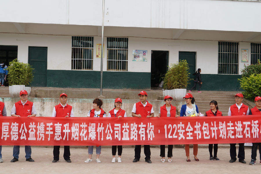 2017年6月6日早上8:30,基金会秘书处和君鑫支部党员义工服务队约20人在基金会办公楼下集合出发,前往大坡镇石桥小学开展关爱活动并捐赠122安全书包,此次捐赠活动,基金会携手惠升烟花爆竹公司向石桥小学捐赠122安全书包279套,价值共计34038元。