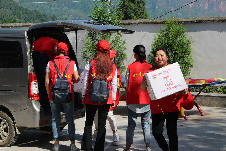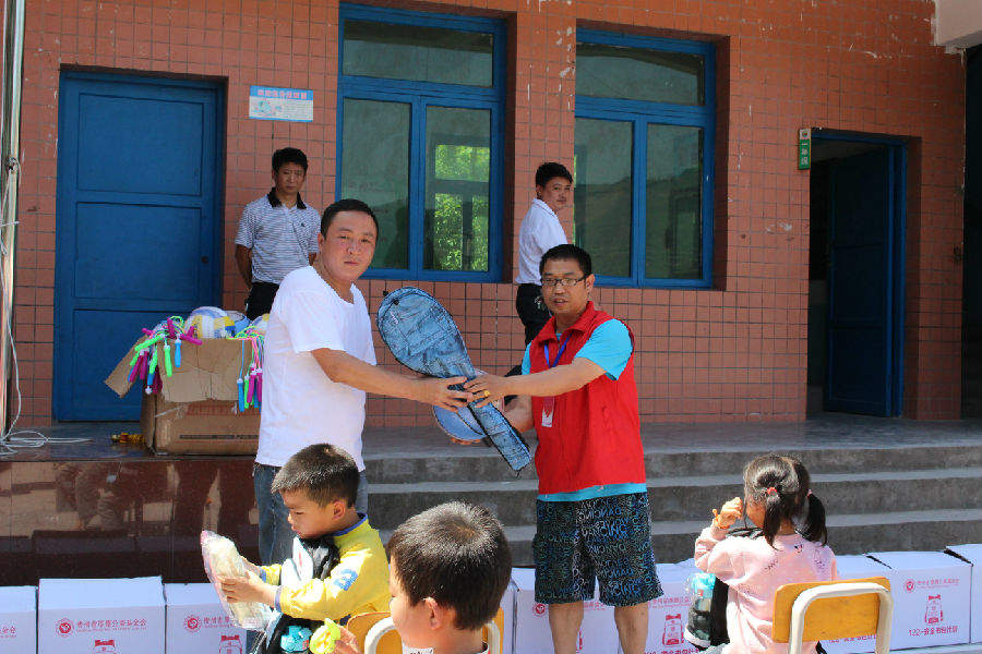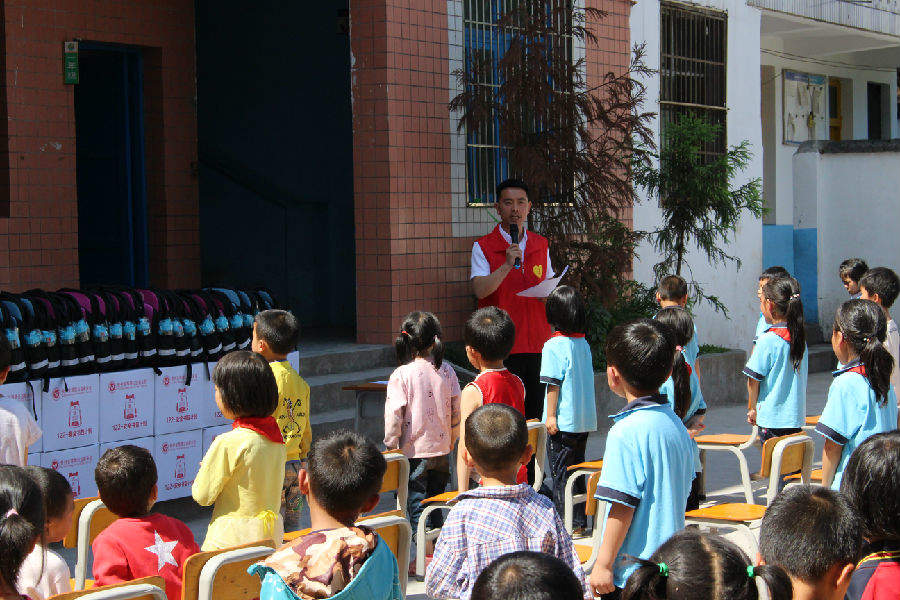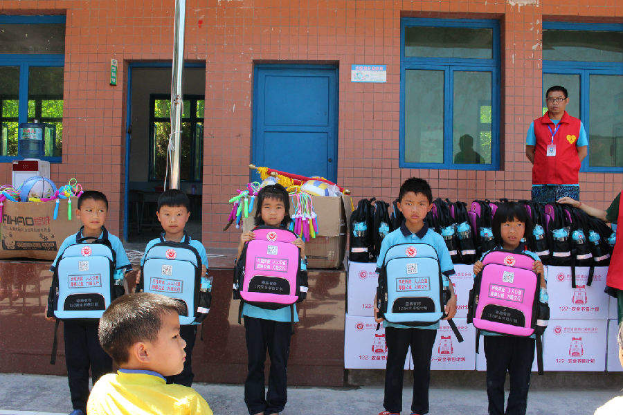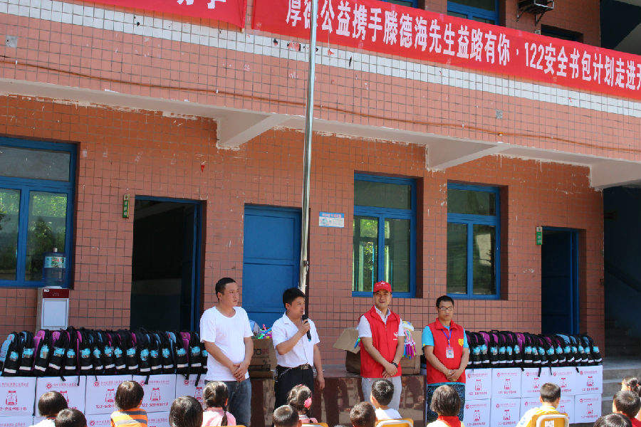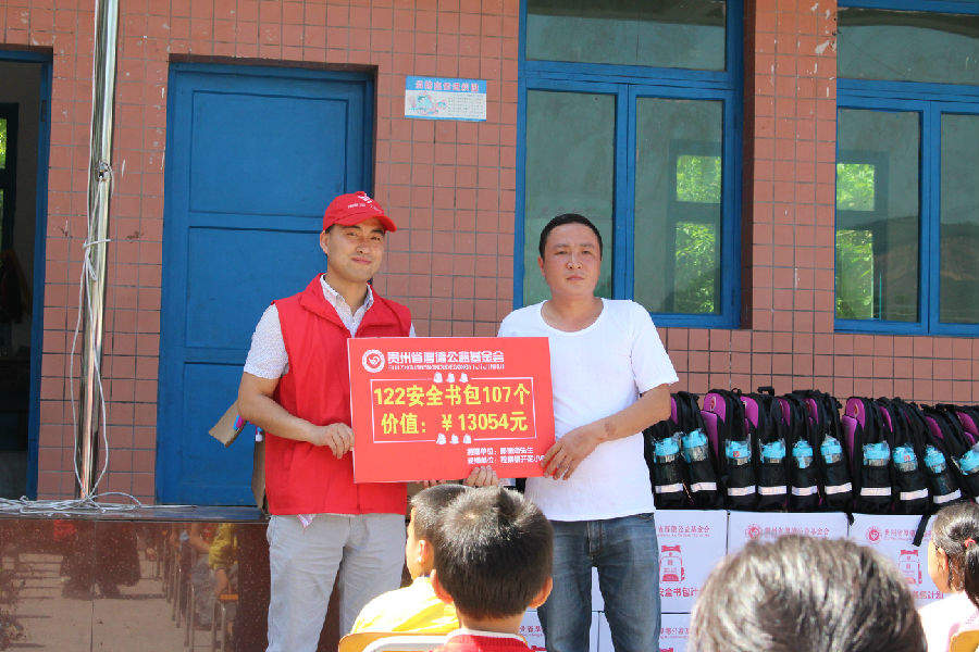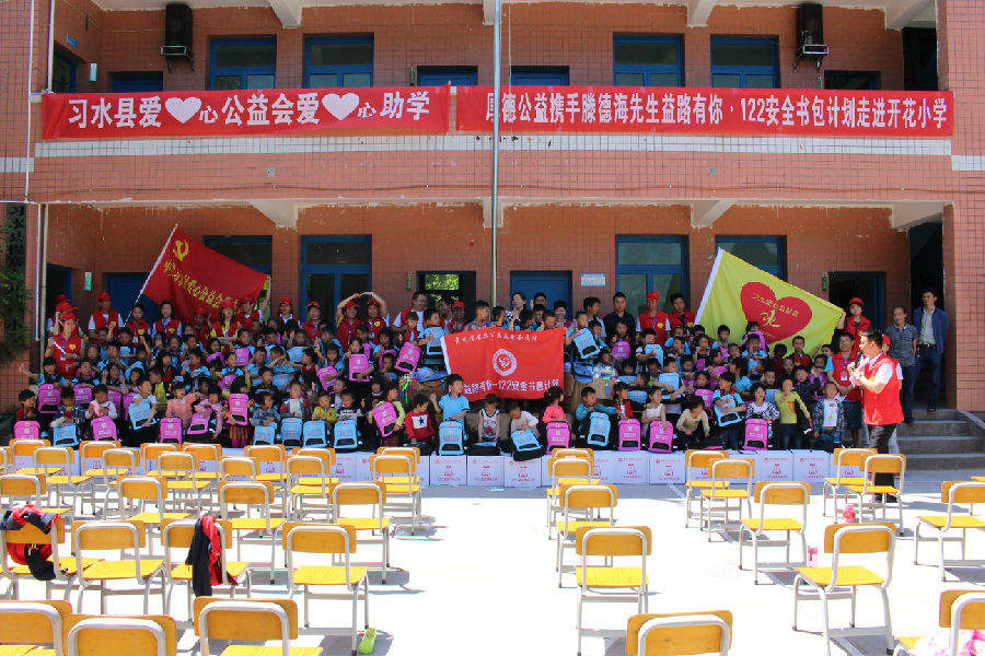 2017年6月7日早上8:30,基金会秘书处和习水县爱心公益会约20名义工在习水体育馆集合出发,前往程寨镇开花小学开展关爱活动并捐赠122安全书包,此次捐赠活动,基金会携手滕德海先生向开花小学捐赠122安全书包107套,价值共计13054元。