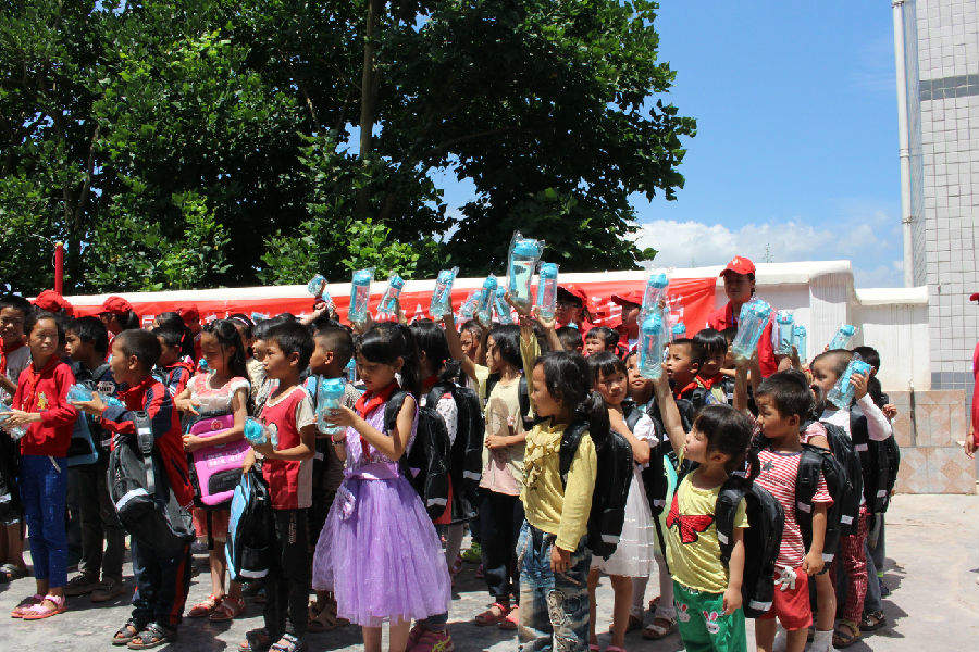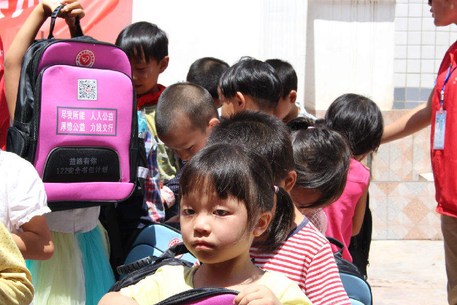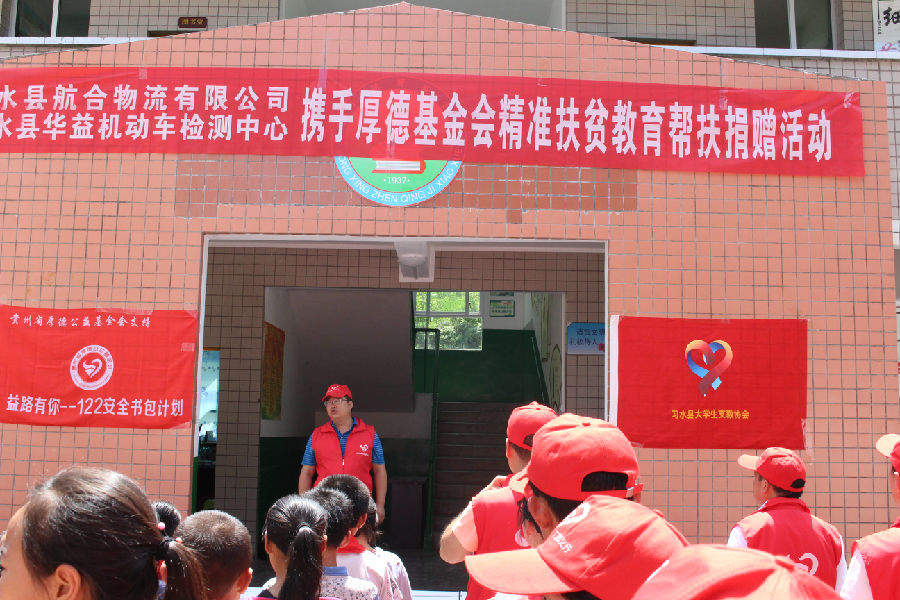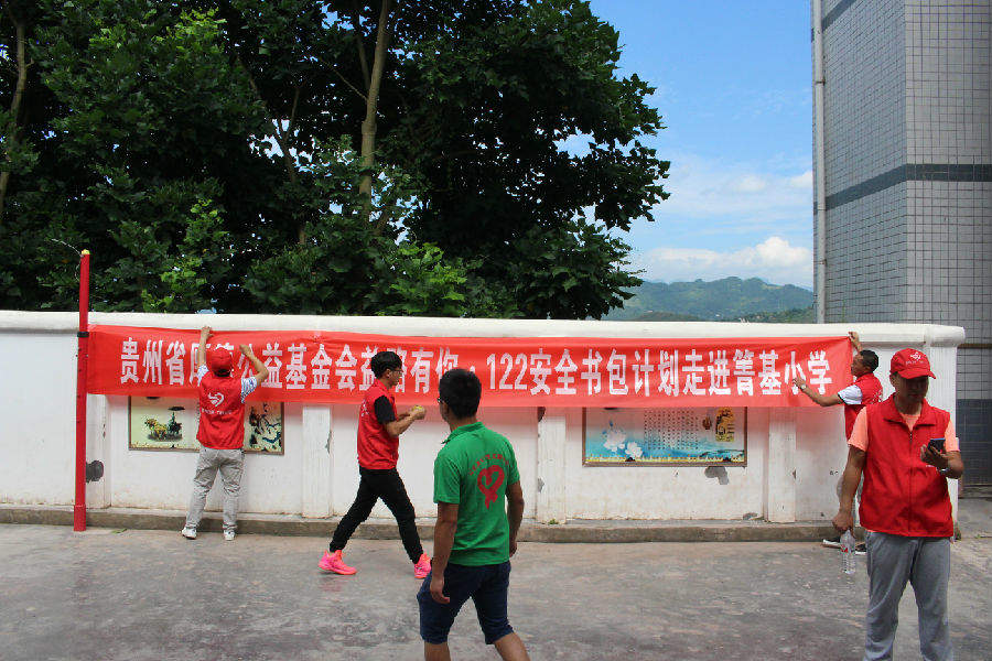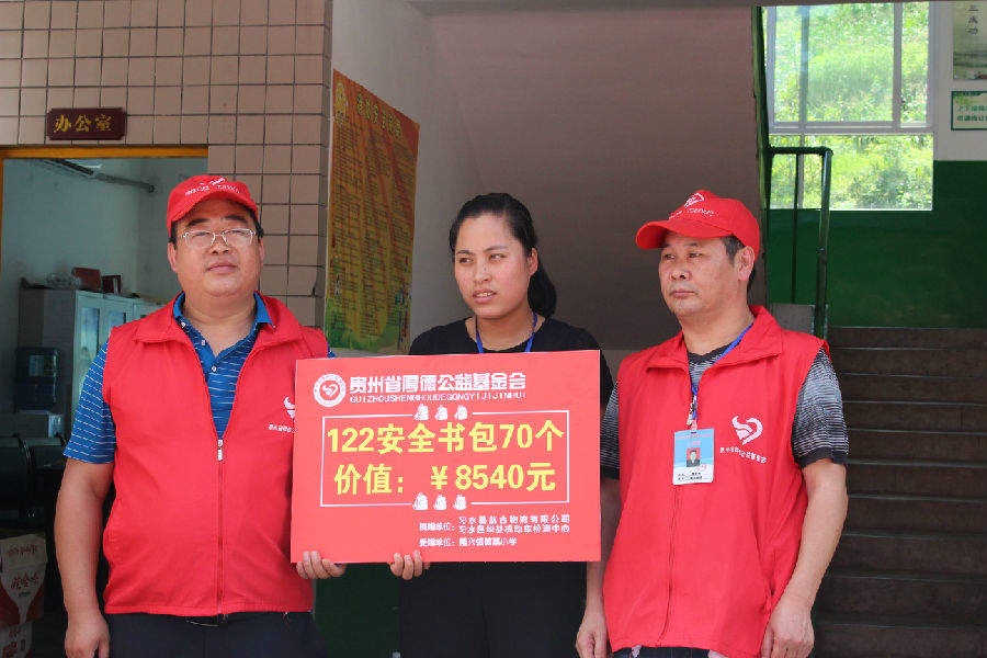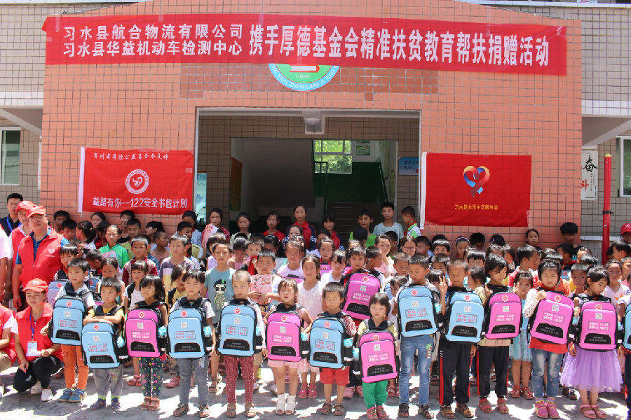 2017年7月21日早上9:00,贵州省厚德公益基金会秘书处,习水企业家商会、习水县航合物流有限公司、习水县华益机动车检测中心约20名义工在基金会办公室楼下集合,前往箐基小学开展项目捐赠活动,此次捐赠活动捐赠“122安全书包”70个,价值共计8540元。