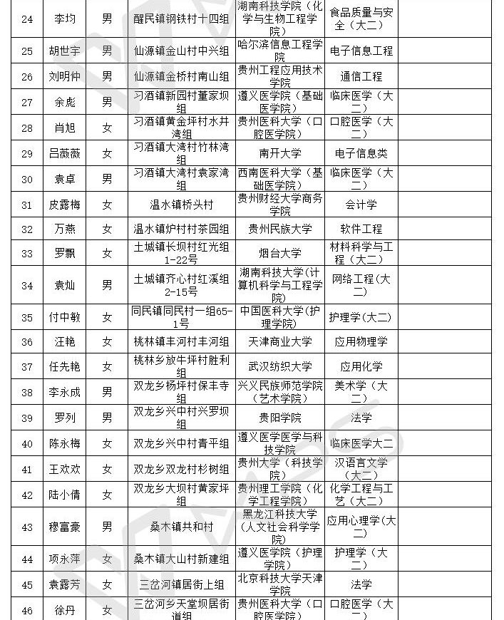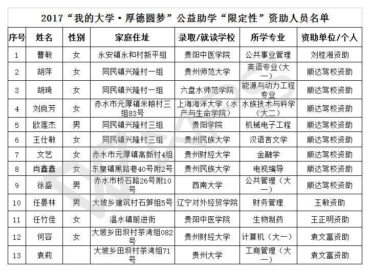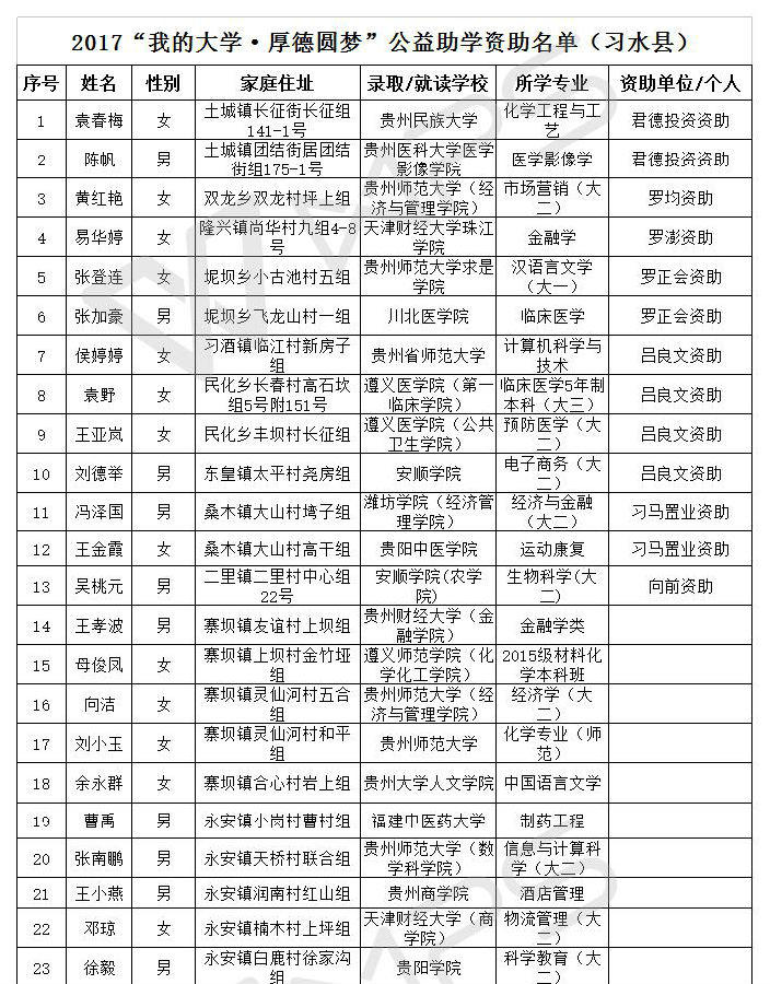 2017“我的大学,厚德圆梦”公益助学计划于2017年7月1日开始接收报名至8月5日晚24点结束报名,共收到411人提交申请,其中:习水县户籍383人,赤水市户籍28人,大一新生212人(赤水户籍14人),大二及以上199人(赤水户籍12人)。经筛查:提交申请的学生中有65人已受到其它第三方资助项目资助,经基金会组织16个义工调查组共65名社会第三方义工在习水和赤水32个乡镇开展贫困学生入户调查走访活动,经基金会项目部开展项目资助评审并报理事会同意,确定资助100名(其中:大一新生36名,大二及以上学生64名),受资助学生中习水户籍85名,赤水户籍15名,现将拟资助名单公布如下,敬请社会各界予以监督,如有意见,请致电:0851-22636565或致信基金会官方邮箱:houde@houdegz.com向我们反馈情况!公示时间:2017年8月19日至21日。