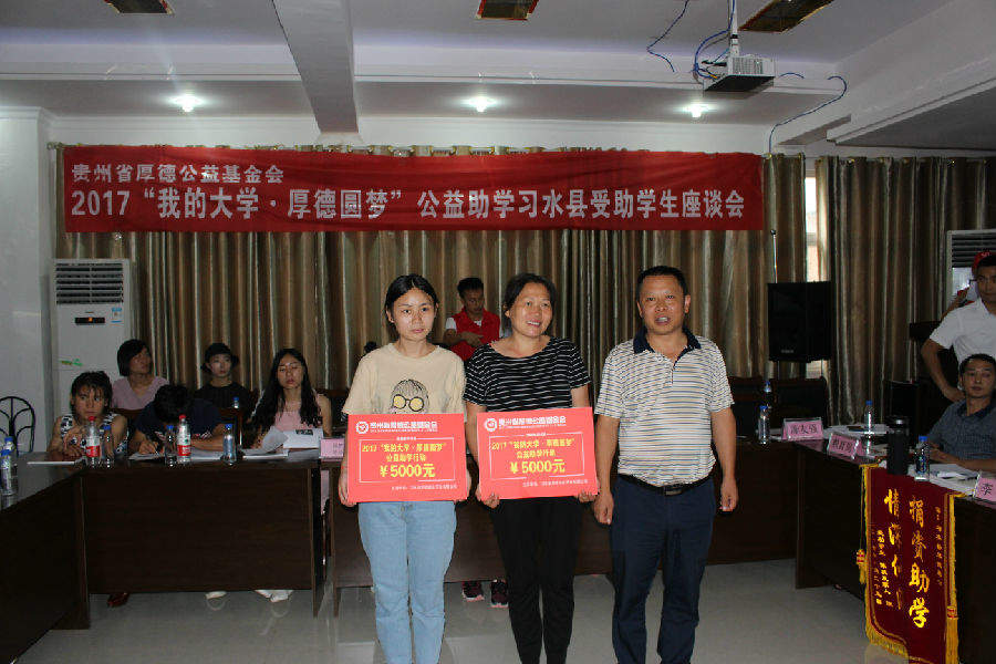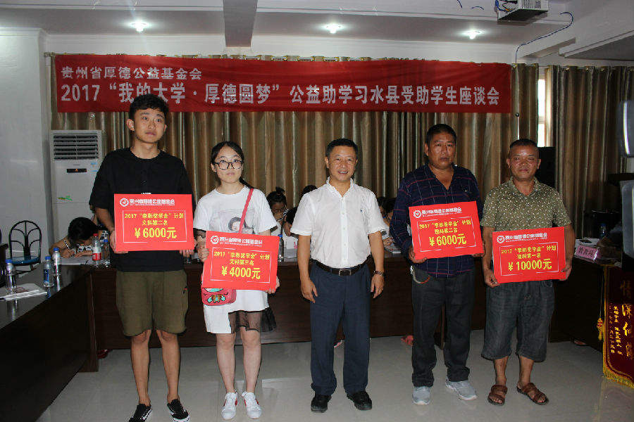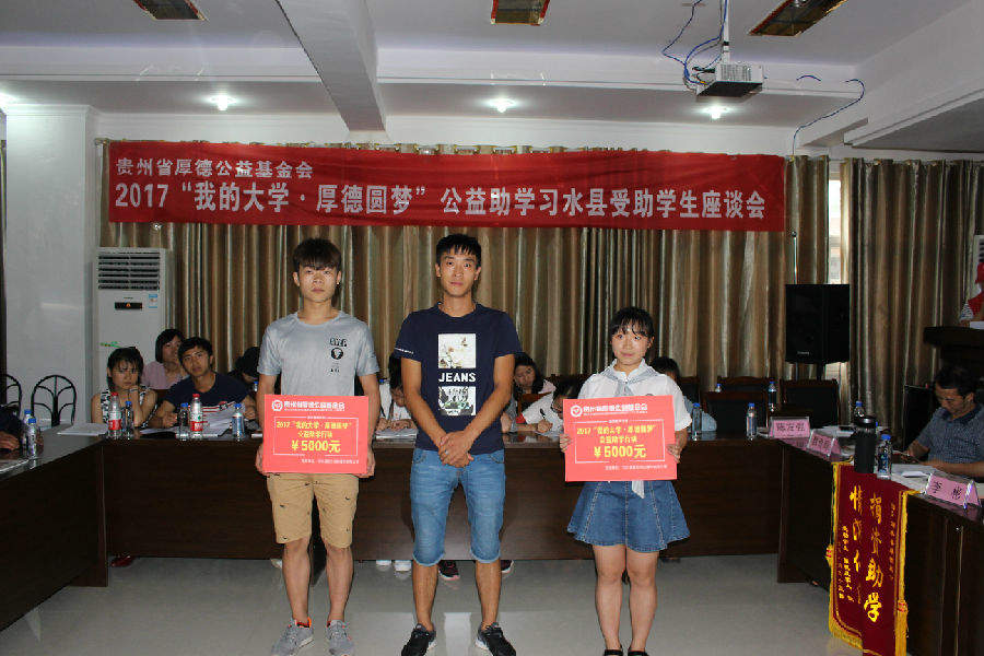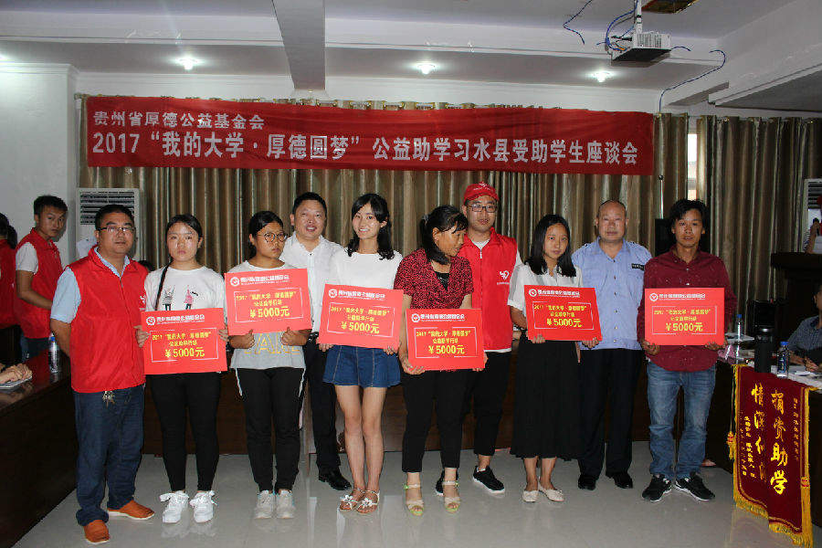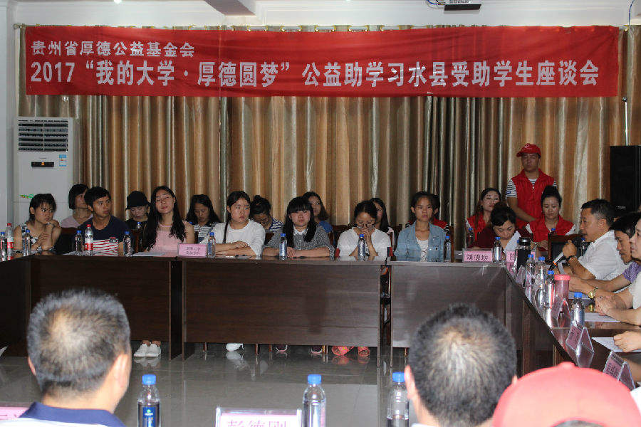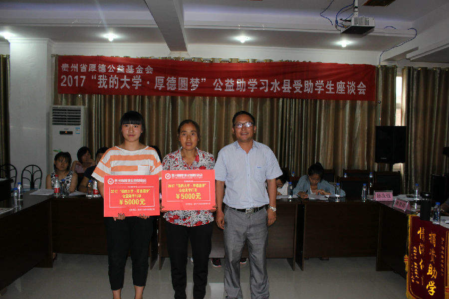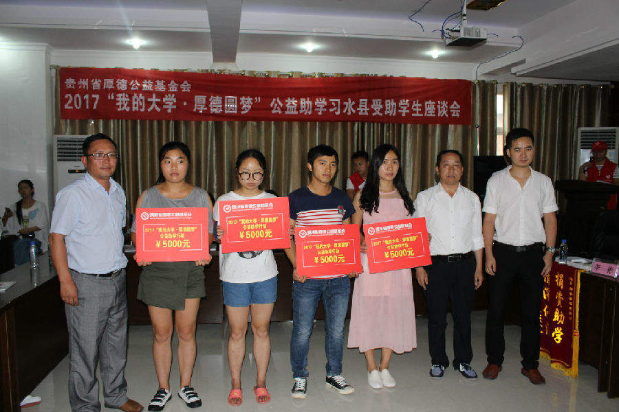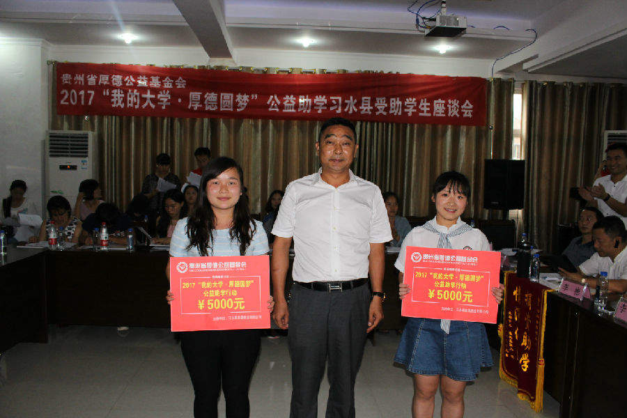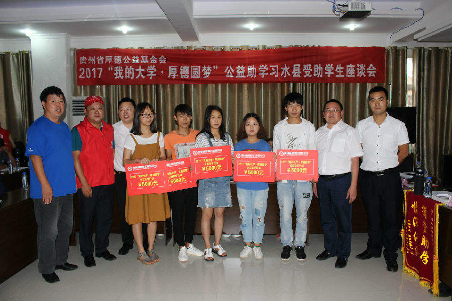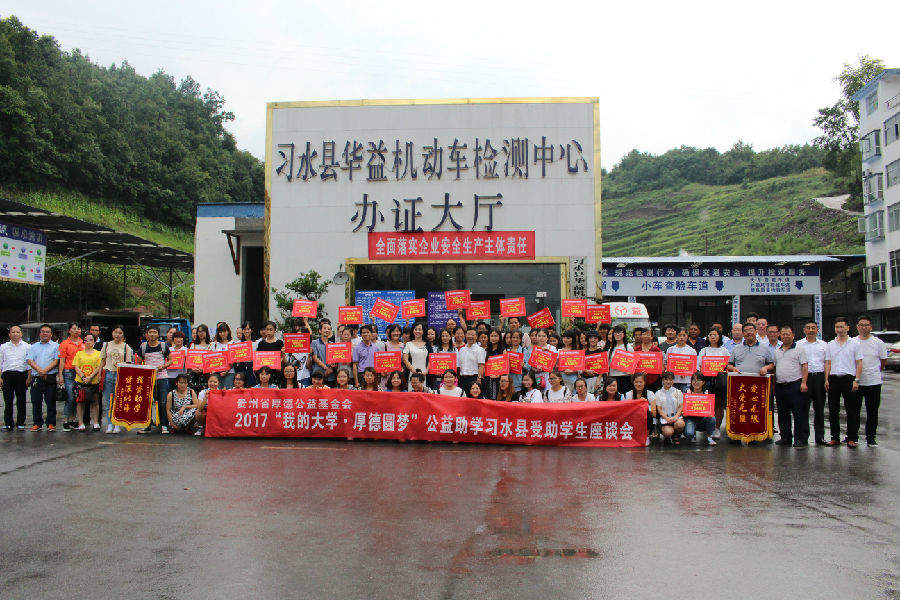 2017年8月25日下午2:00,基金会在习水县华益机动车检测中心二楼会议室召开2017“我的大学·厚德圆梦”公益助学习水县受助学生座谈会并举行捐赠仪式,这次座谈会除受助学生参加外,还有企事业单位领导、捐赠单位代表、捐赠个人、报社记者、电视台记者和这次贫困学生入户调查的社会爱心义工等共计160余人;习水县这次共资助99名贫困大学生(包括“限定性”资助)和6名习水县文理科前三名,资助金额达53.5万元。