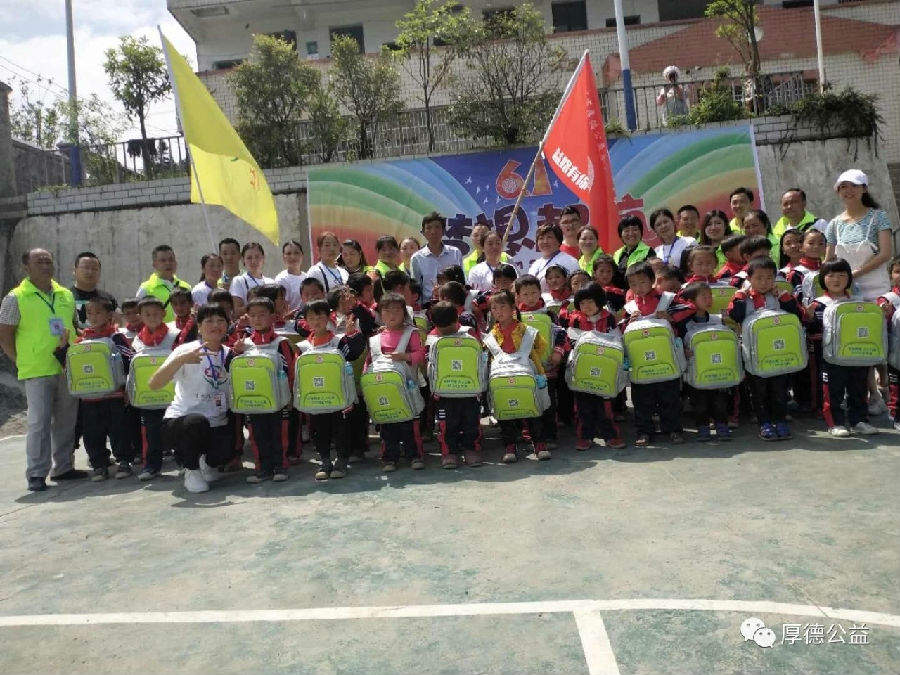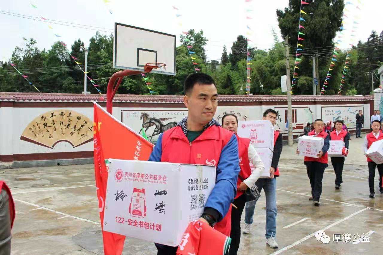 2019年5月23日至5月31日贵州省厚德公益基金会携手习水县企业家商会党员义工队、习水县义工联合会、习水县爱心公益会、习水县红城义工会、赤水市义工联合会,为习水县、赤水市13个乡镇20间乡村小学2873名小朋友送去价值350506元的安全书包;“122安全书包”里面包含:一个书包、一套校服、一个水杯、一本字帖。