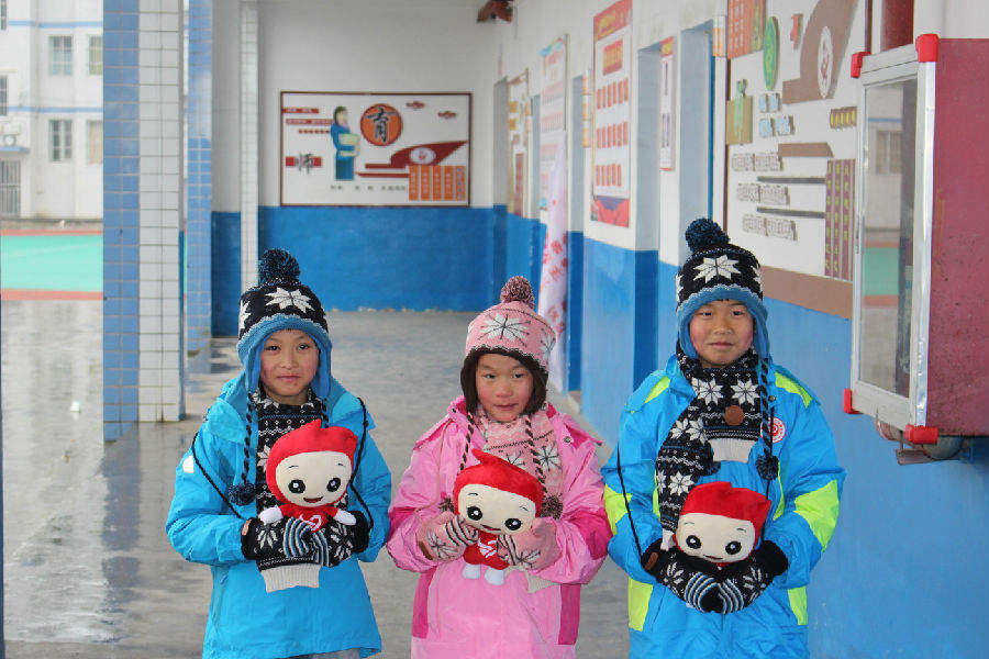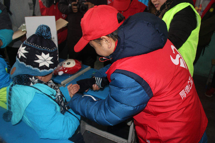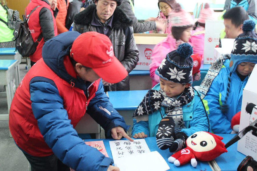 在温暖包中,除了冬日御寒物资以外,还有大爱福娃玩偶和公益字帖。